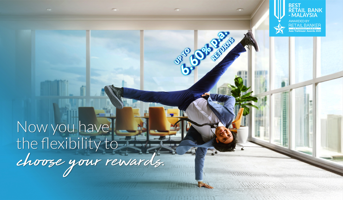Enjoy Bonus Rates of up to 6.60% p.a. Simply deposit a minimum of RM2,000, then sign up for Joy@Work, pay bills, spend, convert, trade, finance or invest.